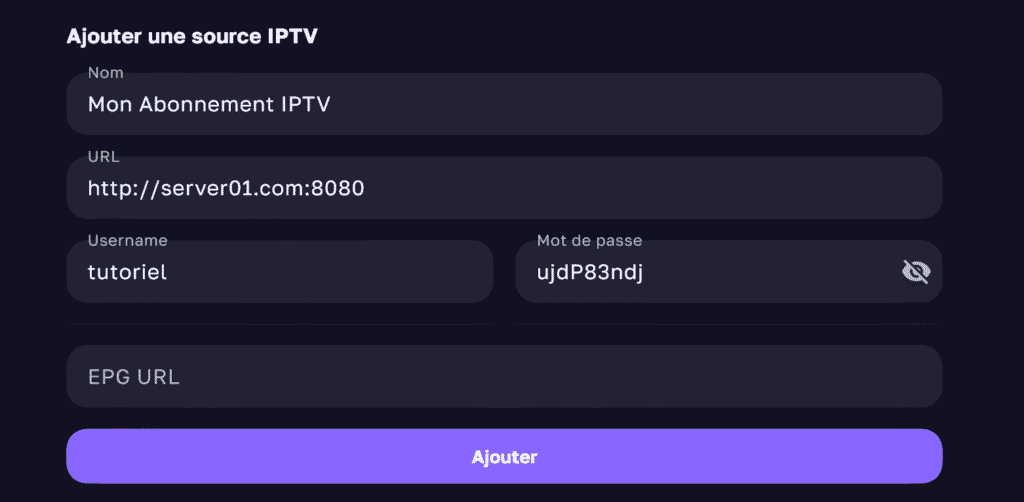 3- Appuyez sur ajouter une source, ensuite introduisez les identifiants de votre abonnement qui vous ont été envoyés par e-mail lors de votre achat (nom d'utilisateur, mot de passe, URL) et appuyez sur Ajouter.