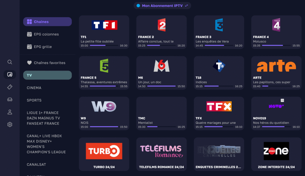 4- Si les codes d'accès ont été introduits correctement, vous devriez vous connecter à votre compte et avoir cette interface principale avec les chaînes TV, les films et les TV Shows.